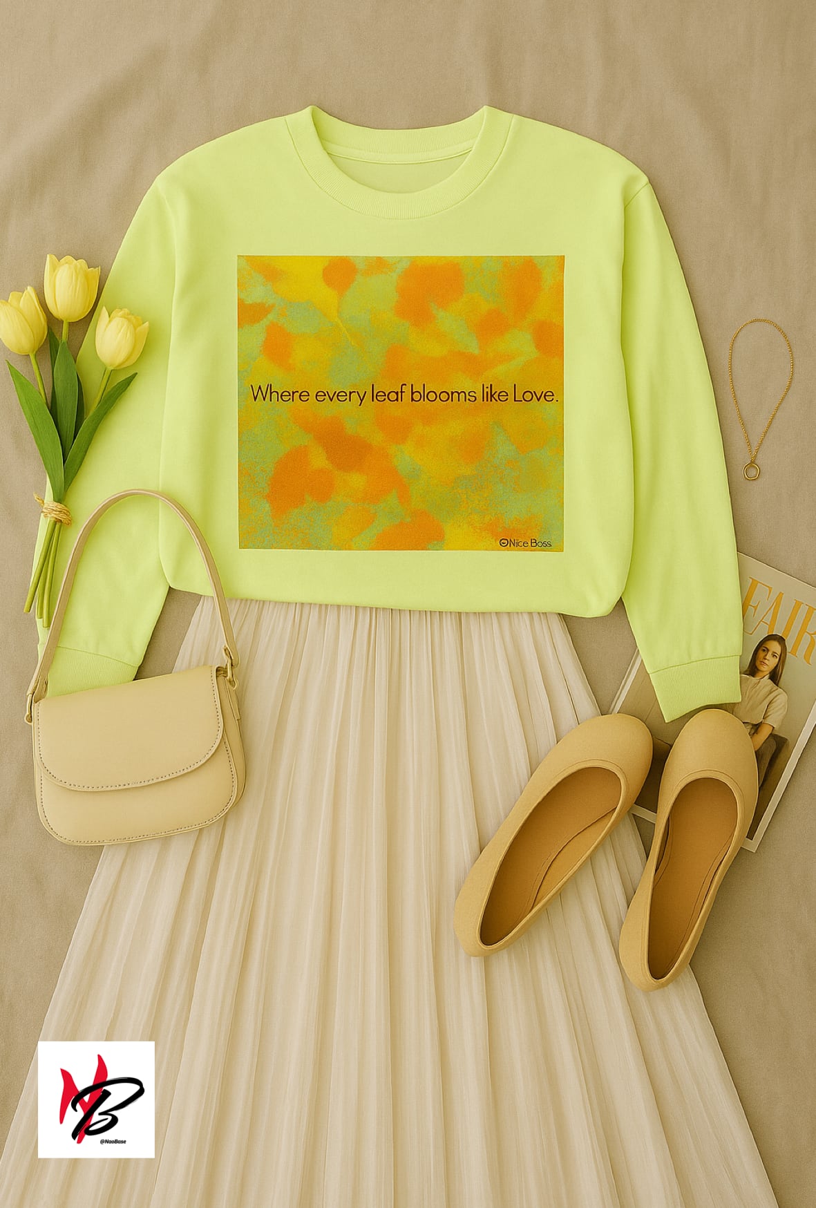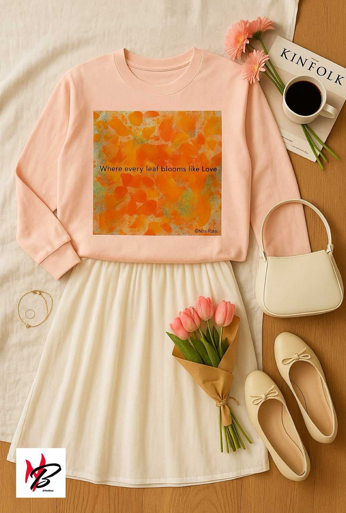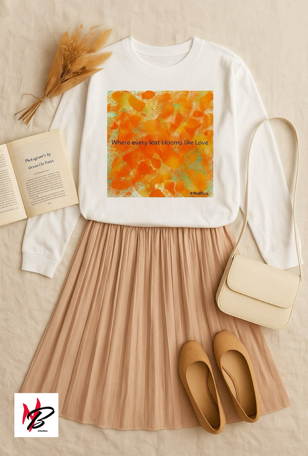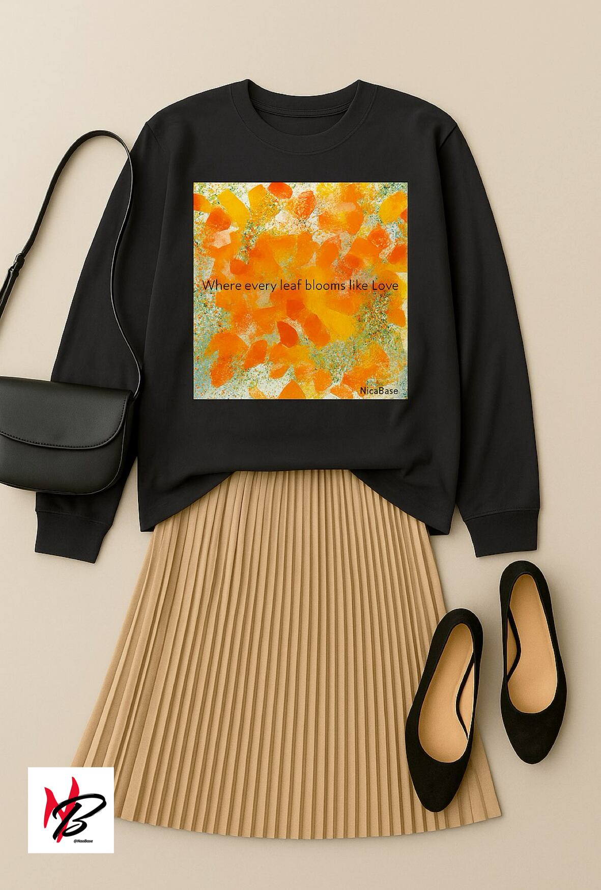 フレーズ “Autumn, where every leaf blooms like love.” を配置。